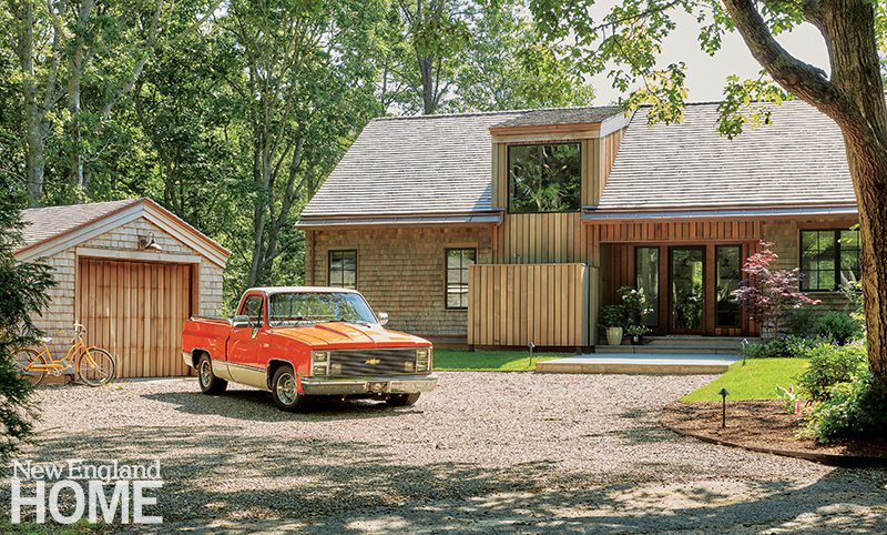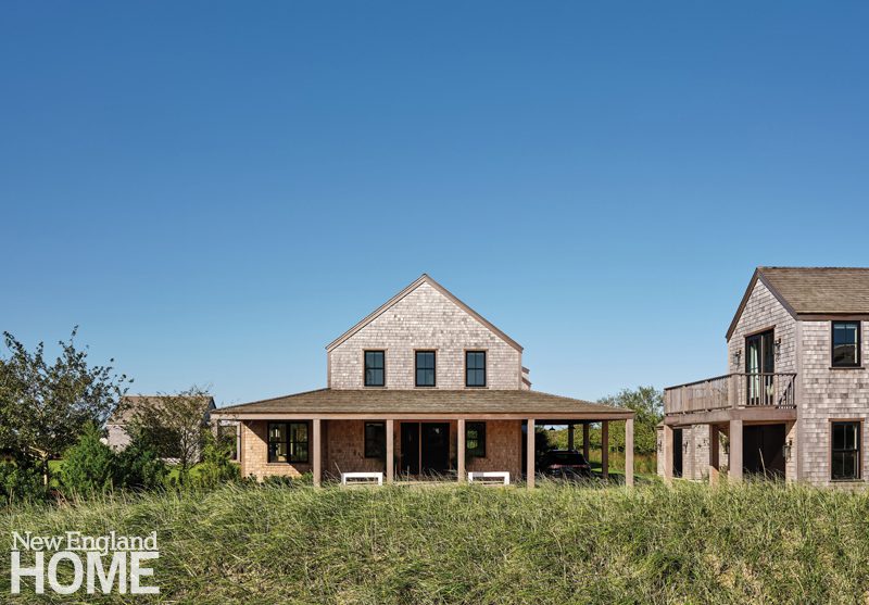 The home, a 2022 PRISM gold award for Best High Performance/High Energy Home, comprises the main house, foreground, attached guesthouse, and stand-alone garage with a second-floor guest suite. Builder Chris Dio clad the house and guesthouse in white-cedar shingles, then crafted sliding shutters of Alaskan yellow cedar to protect the triple-glazed windows from blowing salt and sand.