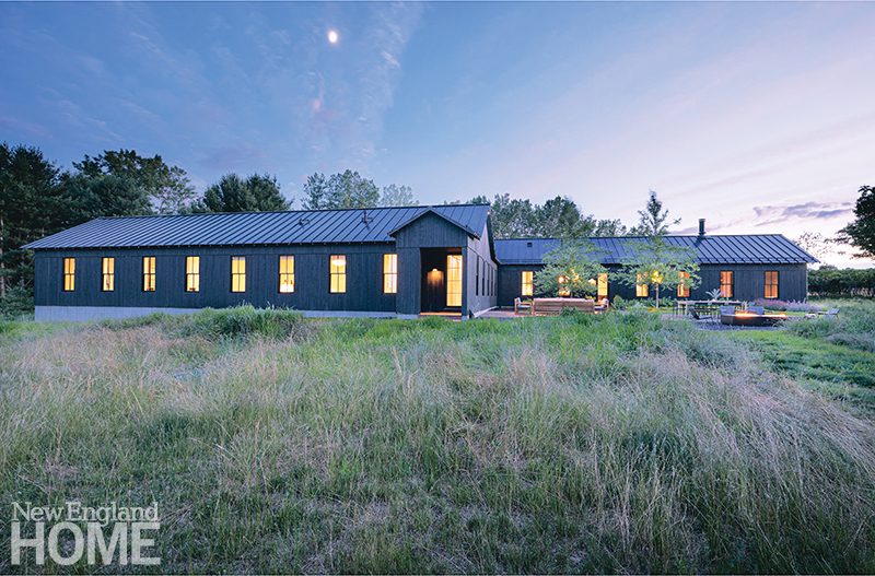 Looking up at the house from the base of the meadow, landscape architect Keith Wagner says the concrete wall “creates a plinth that gives the house a comfortable stance on this sloped site.” The gable ends on the left wing and on the barn face forward, while the middle structure has a broader roofline, a scheme that helps break up the massing of the 5,890-square-foot house.