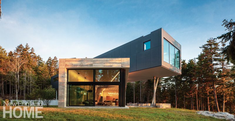 A ledge outcropping on the site dictated the positioning of the house, says architect JT Loomis. The lower level parallels the ledge, while the acute angle of the upper level visually connects the ledge to the water and takes advantage of a gap in the trees to maximize coastal views from the primary bedroom