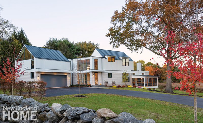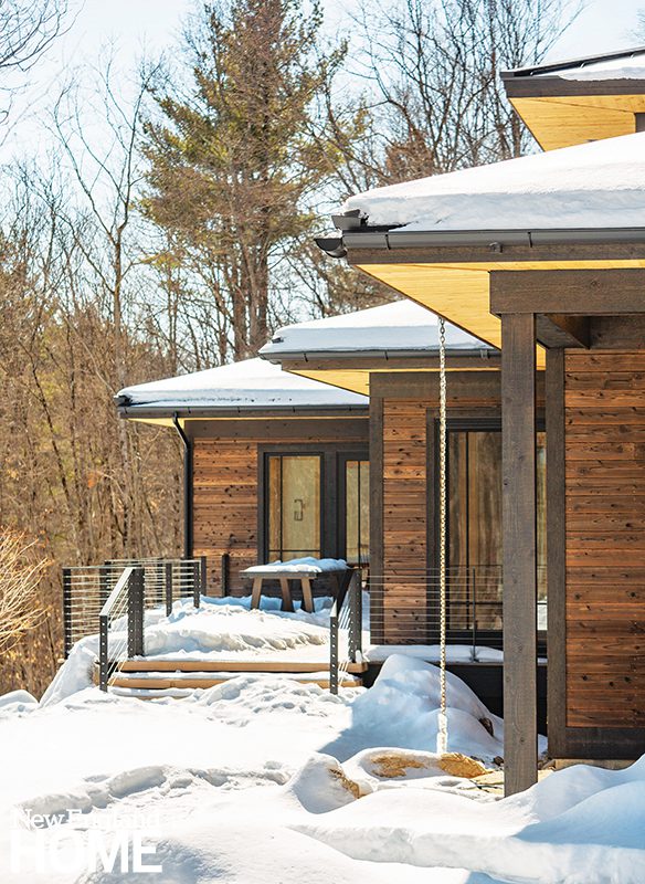 The home, with its H-shaped floor plan, sits on a gently sloping parcel of land at the edge of a meadow that’s filled with cornfields during the summer. Even though it’s in a neighborhood, says builder Forrest Twombly, it exudes privacy.