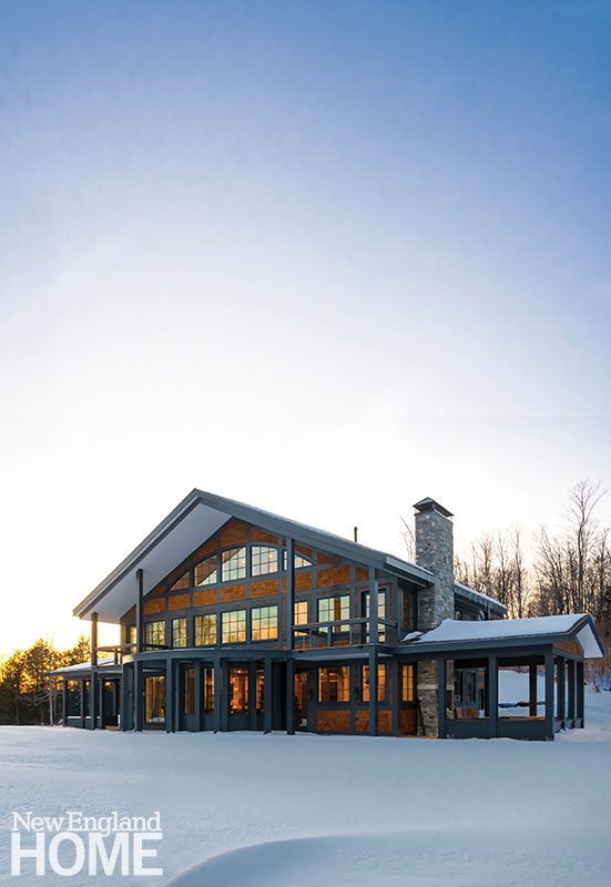 “Being in Maine, I discovered quickly, you only spend so much time inside,” says architect Michael Imber. “The goal is to expand outside.” This large wraparound covered porch with a fireplace does just that—while simultaneously capturing picturesque views of Squaw Mountain and “off-the-charts sunsets,” says Imber.