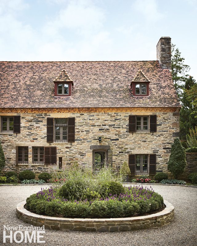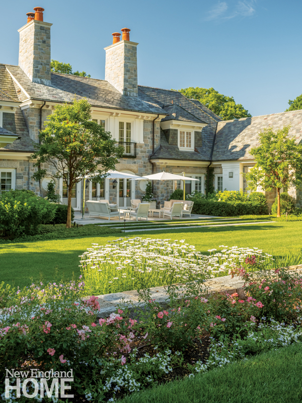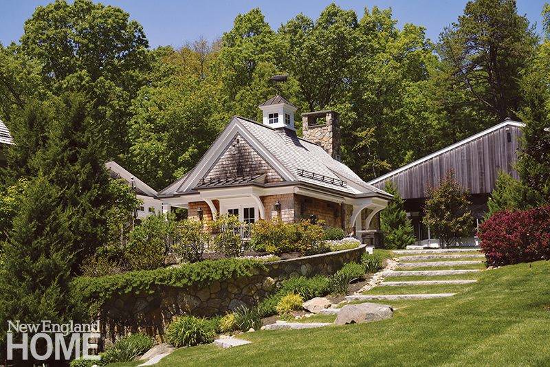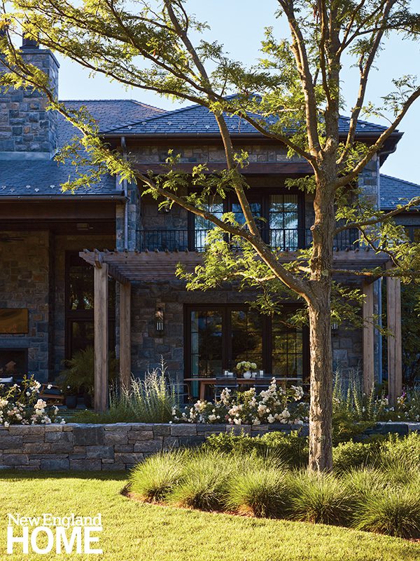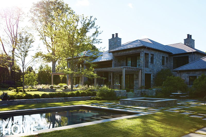 Low Connecticut fieldstone walls match the home’s stone veneer and create gentle definition for the various garden spaces. Spreading boxwoods march along the wall by the pool, straddling the line between formal and relaxed. Both pool and spa, which are set off-center in the yard, have motorized covers that open and close in seconds.