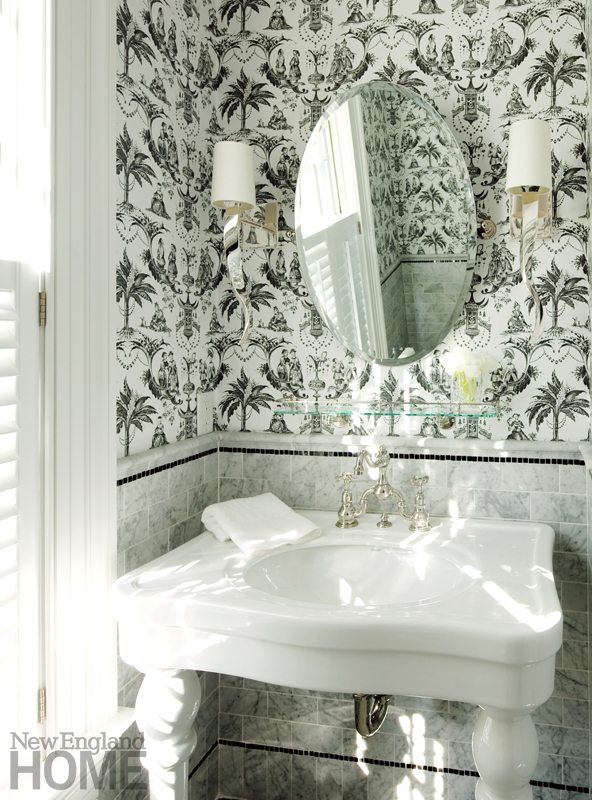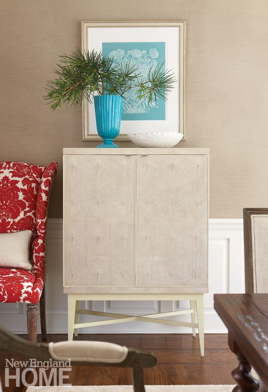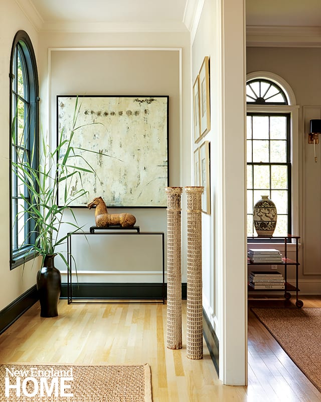 In the living room, Monahan cleverly crafted the windows to appear larger without changing their exterior dimensions by adding a bank of mirrors above the panes. To make a sisal rug pop, she layered a cowhide rug beneath overlapping glass sectional coffee tables. The wall displays the ethereal lines in a pair of works by up-and-coming Connecticut artist Tracie Cheng, while furniture is comfy but sleek.