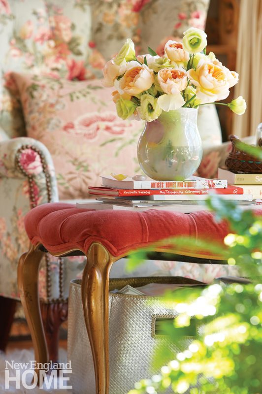 A slew of Williams Sonoma pillows in a host of summery blue tones raises the living room’s comfort level, while a glass top enhances the dining table’s practicality. Leather-bound books and an antique copper boiler add to the hearth’s charm. The handsome rug pulling it all together is from Ballard Designs.