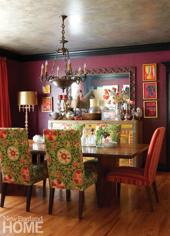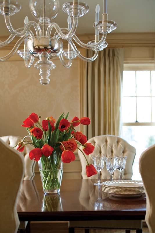 A series of molding-framed murals by Susan Harter could easily steal the scene in the dining room. Instead, Monahan selected the calming earth tones of grisaille, letting her mahogany dining table and antique chairs stand out. A chandelier from Arteriors accents a custom-finish ceiling painted by Deux Femmes Decorative Art.