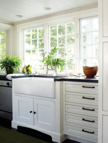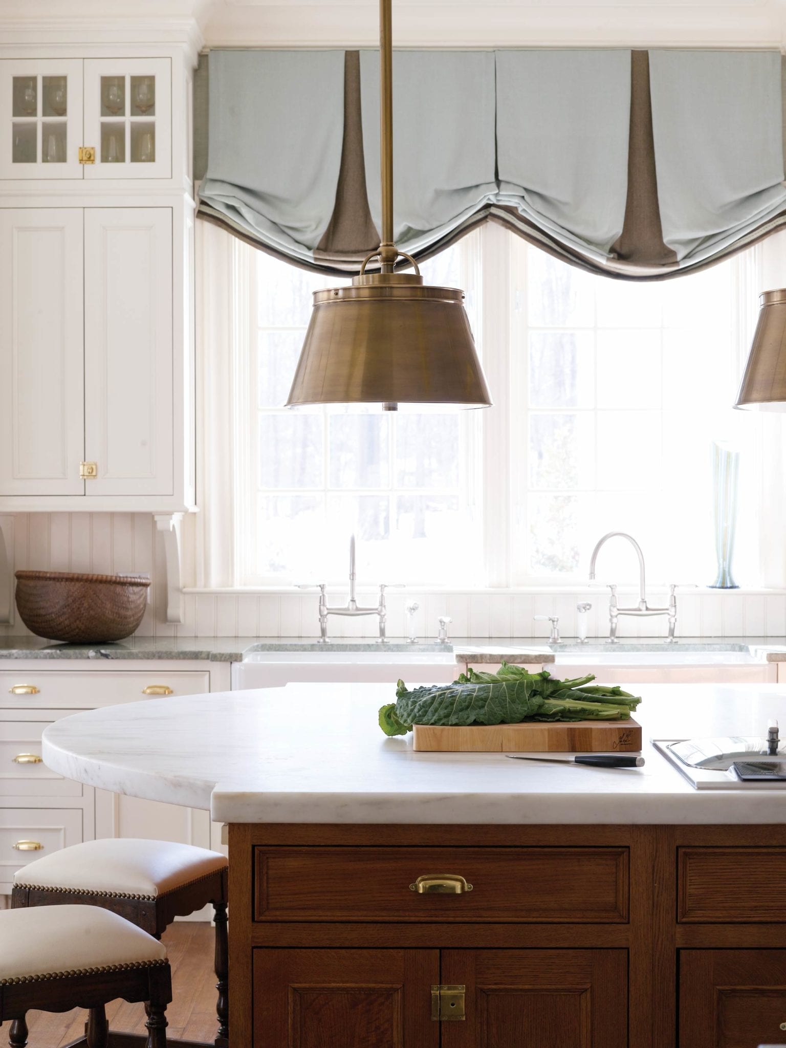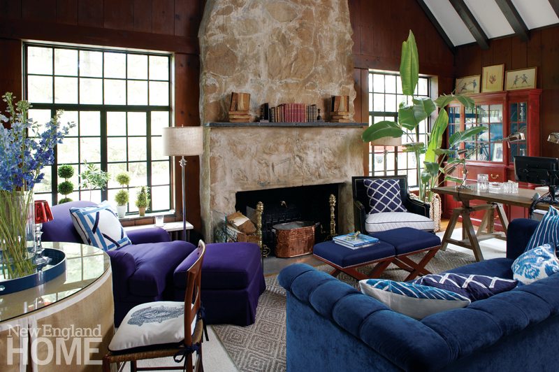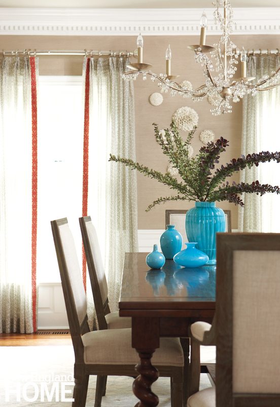 A slew of Williams Sonoma pillows in a host of summery blue tones raises the living room’s comfort level, while a glass top enhances the dining table’s practicality. Leather-bound books and an antique copper boiler add to the hearth’s charm. The handsome rug pulling it all together is from Ballard Designs.