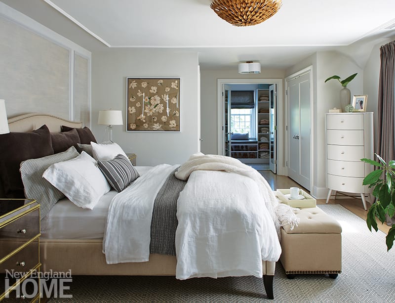 Deux Femmes Decorative Art custom applied a textural linen-like finish to the wall and molded ceiling in the main bedroom. For art, Monahan framed a favorite Tiffany scarf.