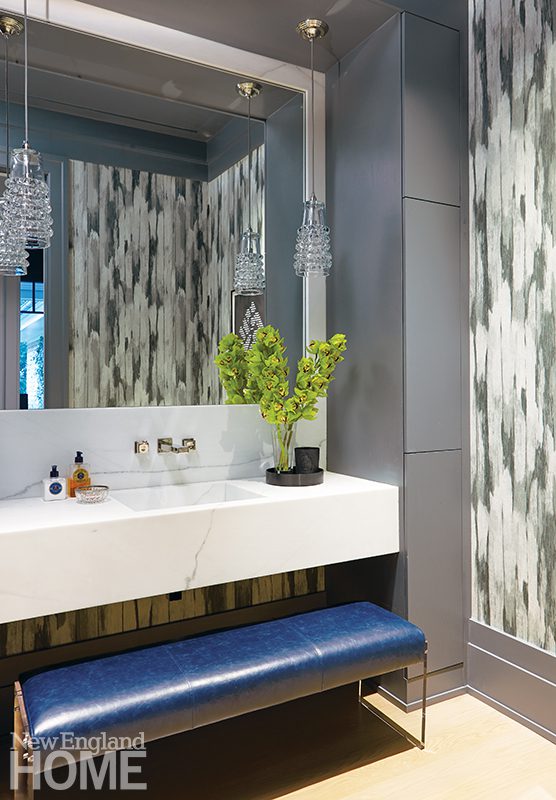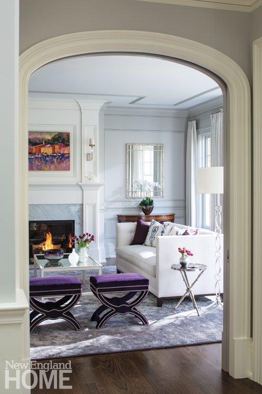 In the living room, Monahan cleverly crafted the windows to appear larger without changing their exterior dimensions by adding a bank of mirrors above the panes. To make a sisal rug pop, she layered a cowhide rug beneath overlapping glass sectional coffee tables. The wall displays the ethereal lines in a pair of works by up-and-coming Connecticut artist Tracie Cheng, while furniture is comfy but sleek.