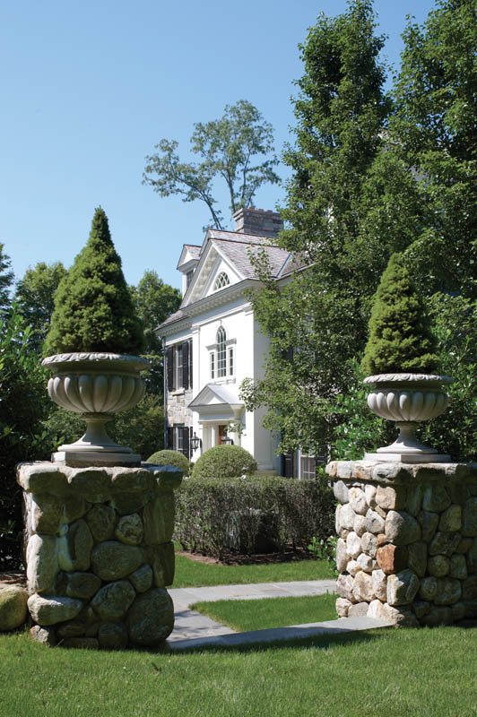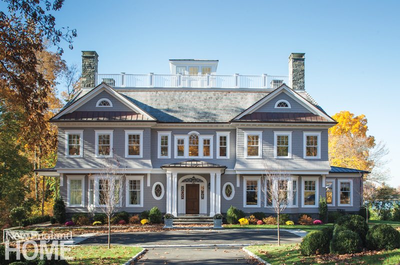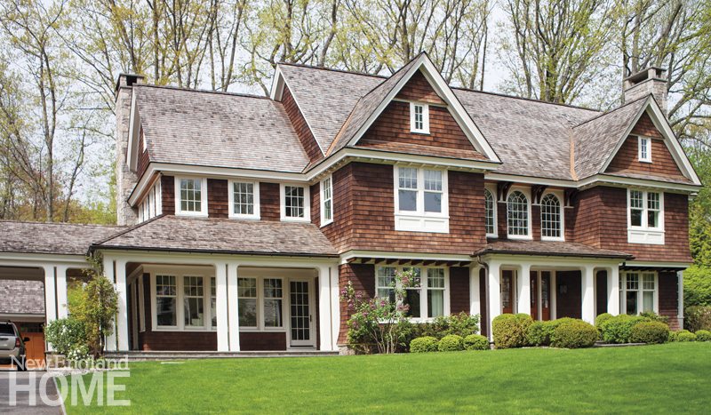 A new tin-roofed wraparound veranda, eyebrow windows, and authentic gaslights from Bevolo of New Orleans add character to the historic home on a hilltop in Wilton.