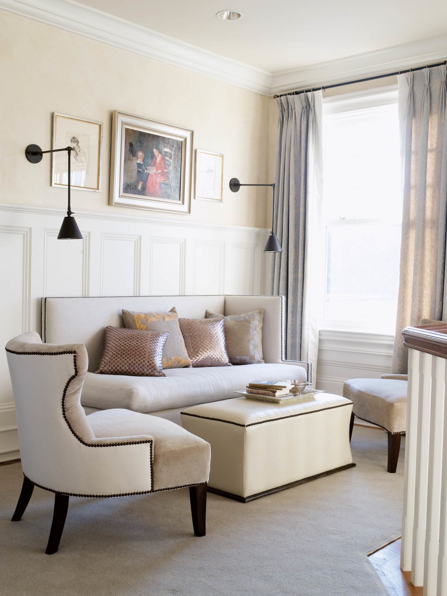 "Timeless but also livable and fresh," is how designer Lynne Scalo defines the elegant living room and its medley of handsome textures. Silver sconces flank a piece of contemporary art, while a more classic painting and a rustic mirror hang nearby-a perfect example of the designer’s keen eye for mixing and matching.