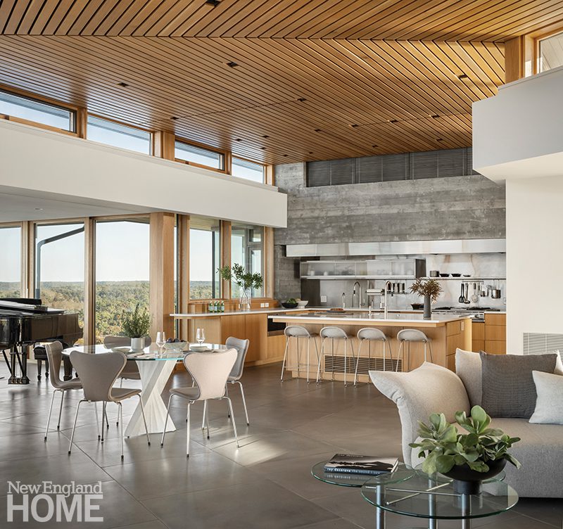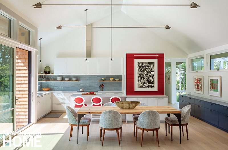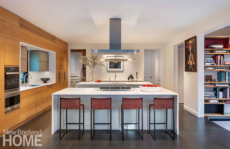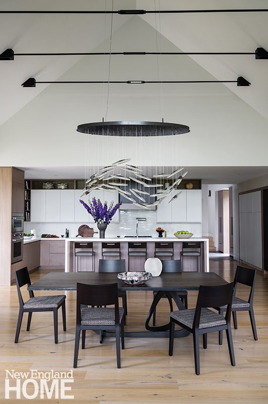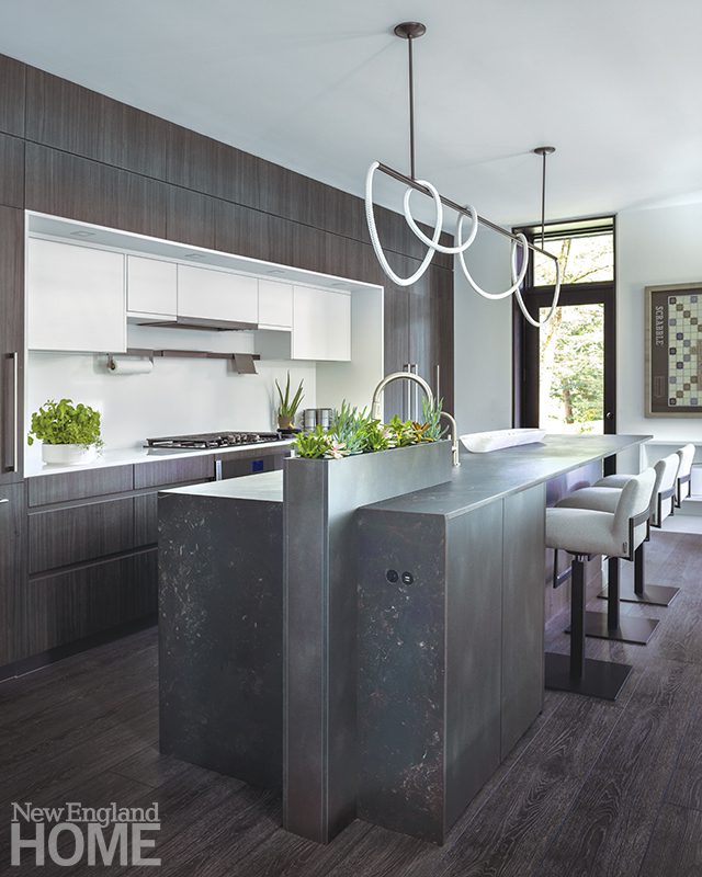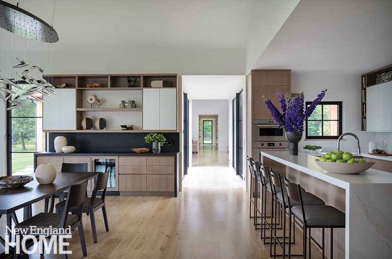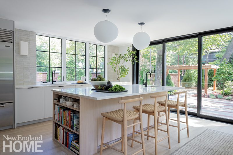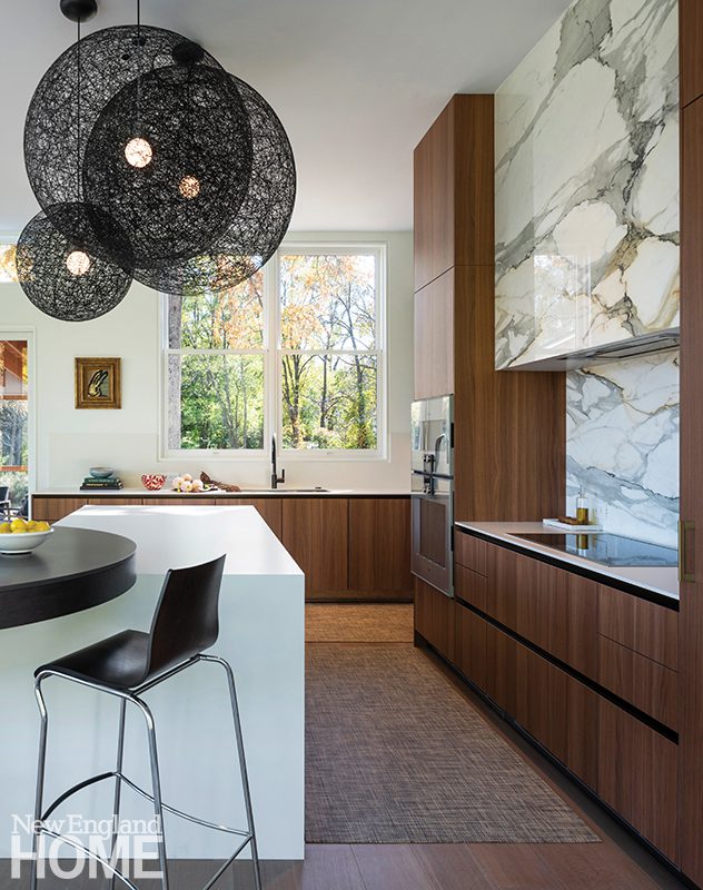 The Zen-like kitchen has no upper cabinets to break sight lines. An adjacent pantry provides plenty of storage, and Knoll stools around the island add contrast. The range hood is Tadelakt Moroccan lime plaster crafted by Jonathan Ives of Shoreham, Vermont. Ceiling pendants and Hakwood engineered white-oak flooring add to the Japanese sensibility.