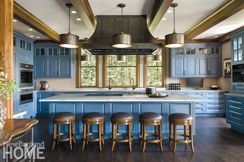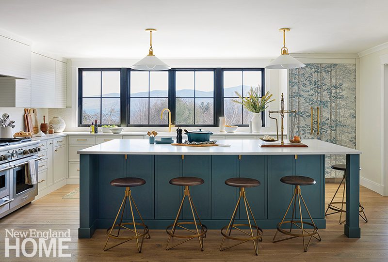 Counter stools (with brass details on the footrests) surrounding the pewter-topped kitchen island were what prompted the wife to contact Gannon.
