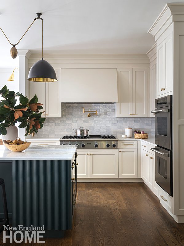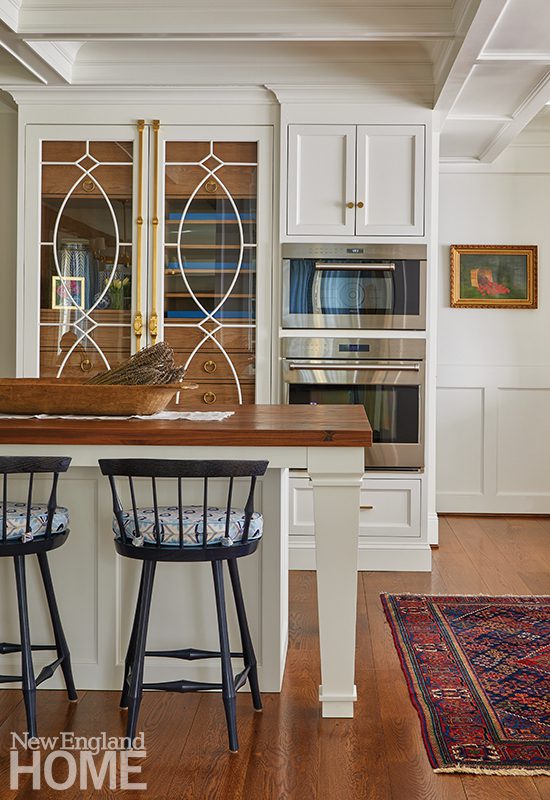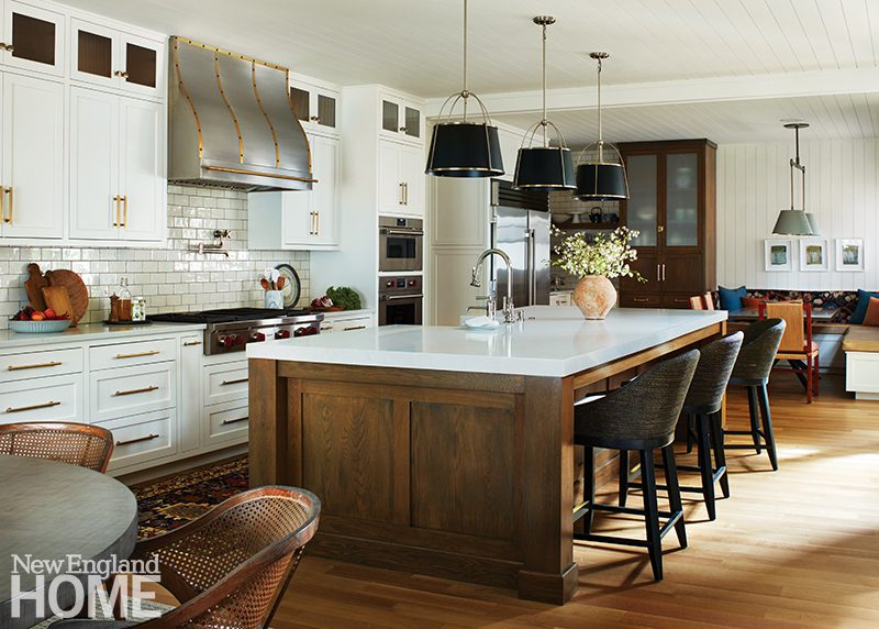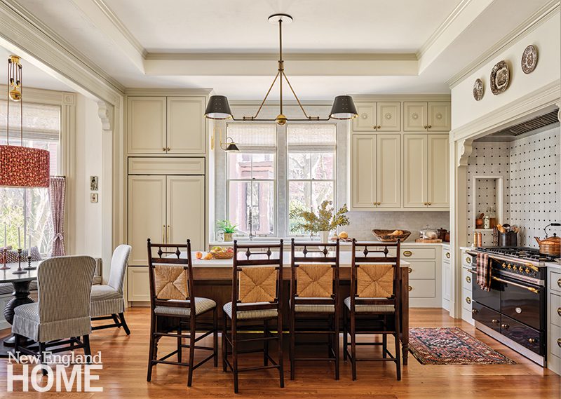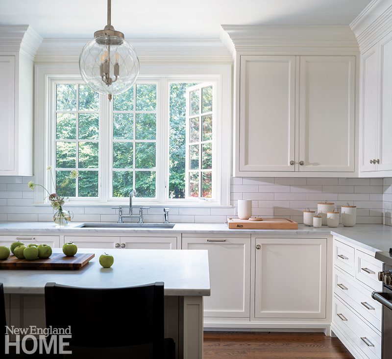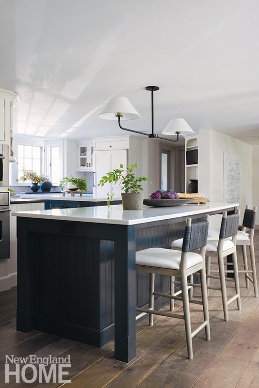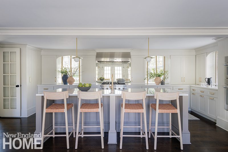 Because the home’s gut renovation by BSA Construction and Payne | Collins Design called for relocating the kitchen and opening it to the formal living room, Hogarty had the uppers of the Christopher Peacock cabinetry painted the same shade of white as the walls. “We wanted to soften the functional aspects of it,” she says, “to make it feel more like millwork than just a kitchen.”