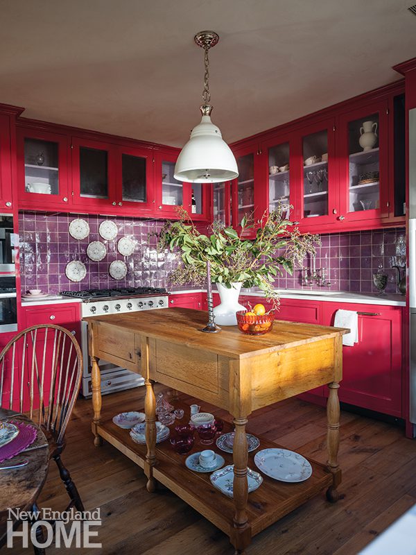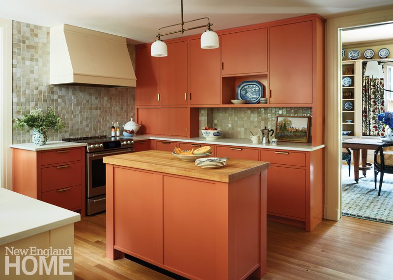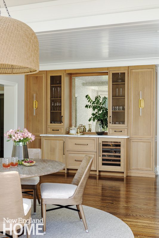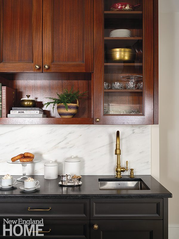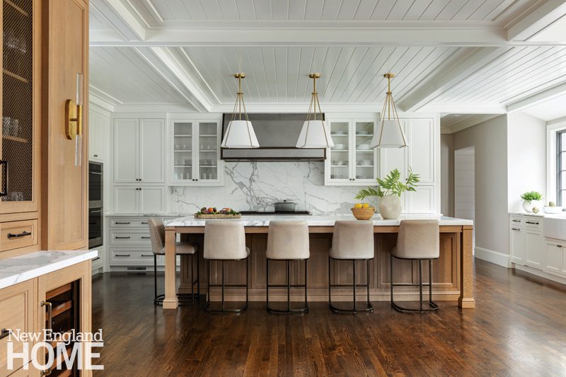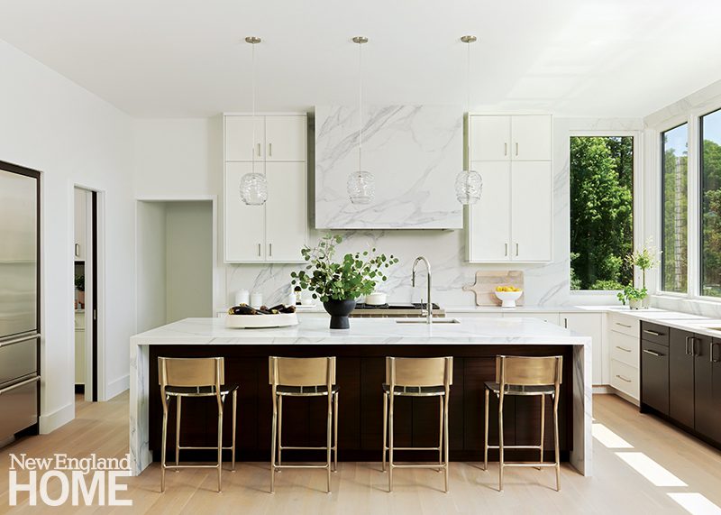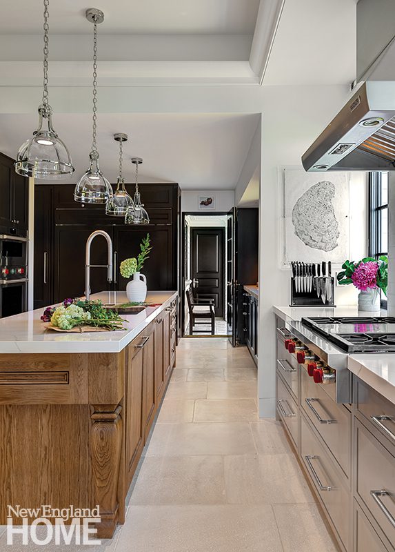 Because the home’s gut renovation by BSA Construction and Payne | Collins Design called for relocating the kitchen and opening it to the formal living room, Hogarty had the uppers of the Christopher Peacock cabinetry painted the same shade of white as the walls. “We wanted to soften the functional aspects of it,” she says, “to make it feel more like millwork than just a kitchen.”
