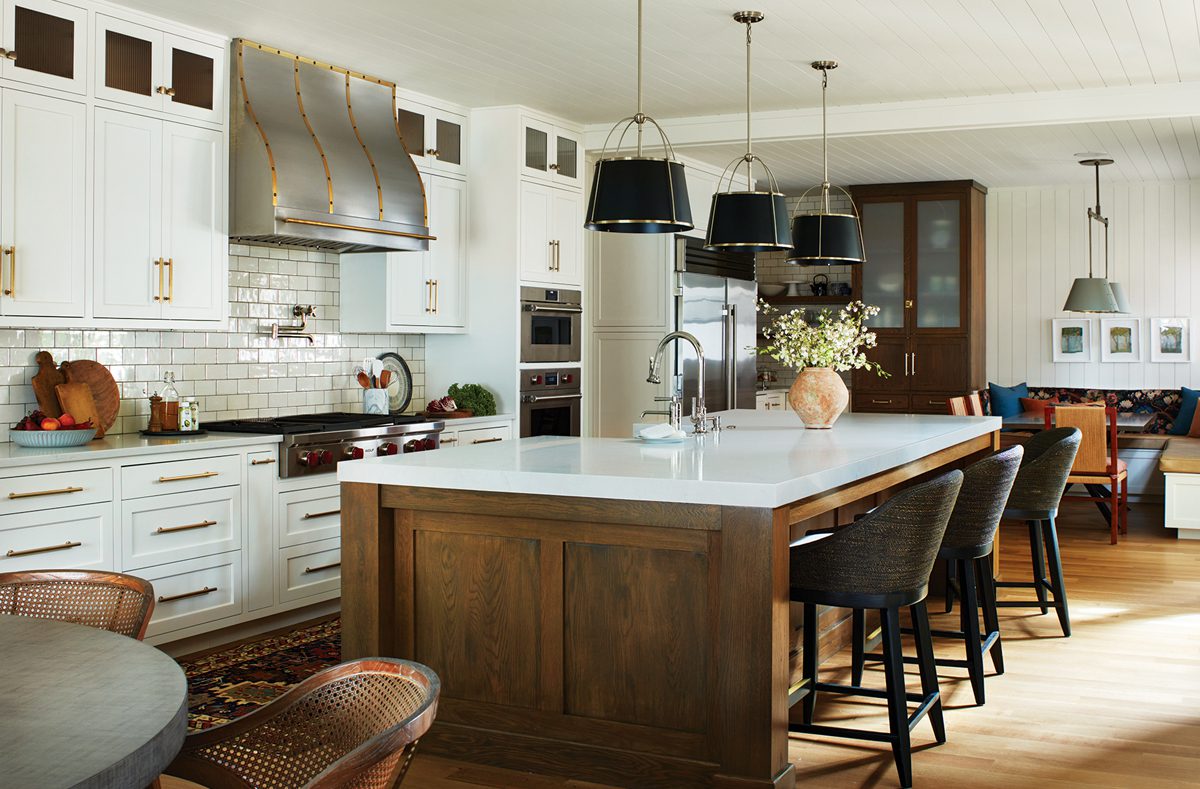 To satisfy his clients’ craving for contemporary, architect Kyle Sheffield devised a glass addition in the back of the house that includes the kitchen, dining area, and family room. “This space is such an extension of them,” he says. “It really embraces the point-counterpoint dialogue between modern and traditional.”