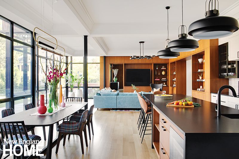 The existing kitchen was very rudimentary, so the design team started from scratch, transforming a hodgepodge of small spaces into a larger contemporary kitchen with soapstone countertops and Schoolhouse lighting.