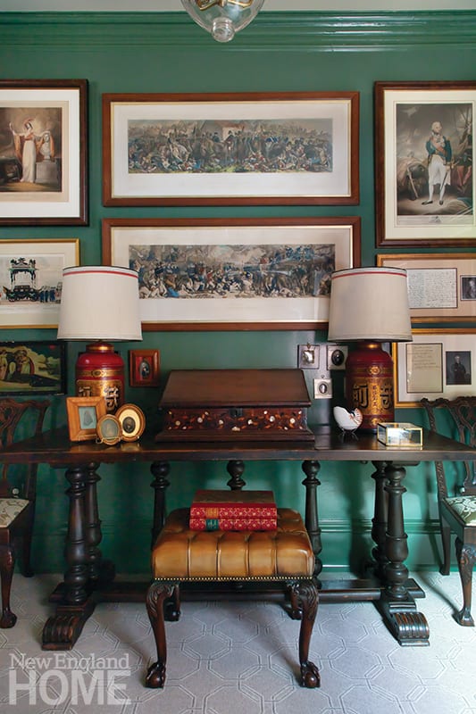 Forest-green walls give the library, James Schibanoff’s favorite room in the house, a cocoon-like feeling.