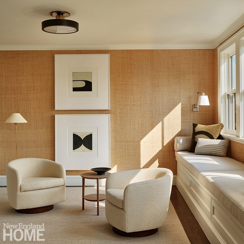 Designer Chauncey Boothby uses New England-based products, like this wool rug from Boston designer Meredith Thayer, whenever she can. Likewise, artwork is by regional artists through Maine Art Hill gallery. The living room paintings are by Craig Mooney, while the piece near the stairs is by Janis H. Sanders.
