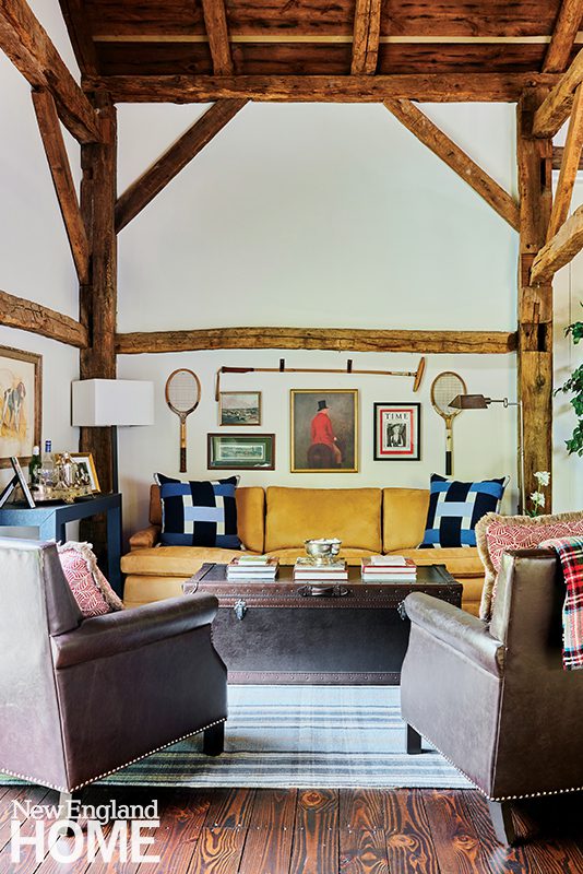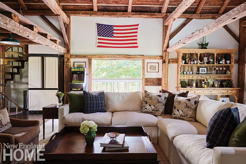 Twin sofas further fireside relaxation in the welcoming great room. The eagle from Nantucket’s John Rugge Antiques, an eclectic plate collection, and two shadow boxes featuring exquisite handmade vegetables on gilded backgrounds boost visual interest. So does the tabletop’s large scrimshawed whalebone by Jon Laubin from Nantucket’s Sylvia Antiques.