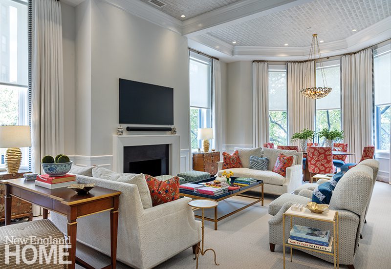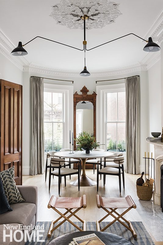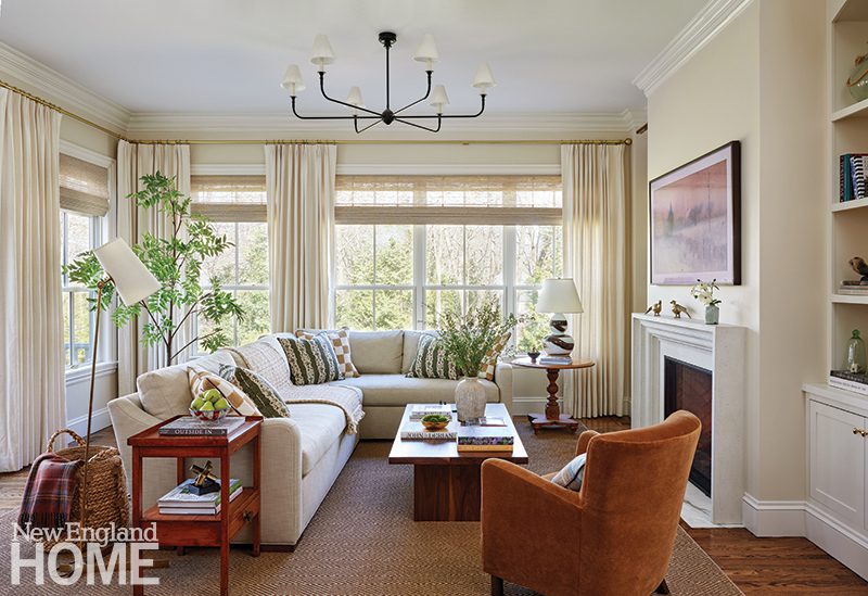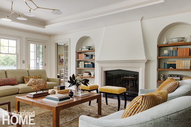 As with the Shingle-style country houses he designed, William Ralph Emerson gave this Cambridge home a large living room that invites a crowd. With the original fireplace as the focal point of the room, interior designer Kate Maloney created an airy, modern vibe fortified with a custom O’Lampia chandelier. The chenille sofa is balanced with custom chairs by Partners in Design.