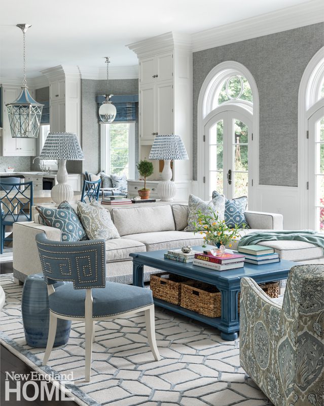 The living room’s blue-and-white palette and a Steven King ombré rug that subtly evokes ocean waves give the space a hint of a coastal feel. A modern light fixture from Lumfardo and a leather lounger add a midcentury touch.