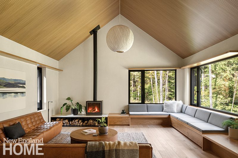 Built with hefty reclaimed granite blocks, the fireplace, one of two that anchor the great room, was constructed by King Stoneworks. The bespoke rug, designed by Farmer with Steven King Decorative Carpets, establishes the nature-inspired palette. The cathedral ceiling is sheathed in clear pine boards.