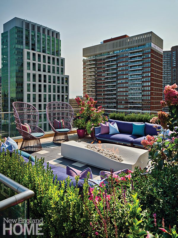“We wanted the upper level to be at grade, so the courtyard would be part of daily life,” says Flavin, who splayed one wing to welcome in the surroundings and painted the entire rear gray to give the house a hushed presence in the landscape. Each element—from the specimen trees to the grill—was carefully selected, prompting the owners to refer to this as their “curated courtyard.”