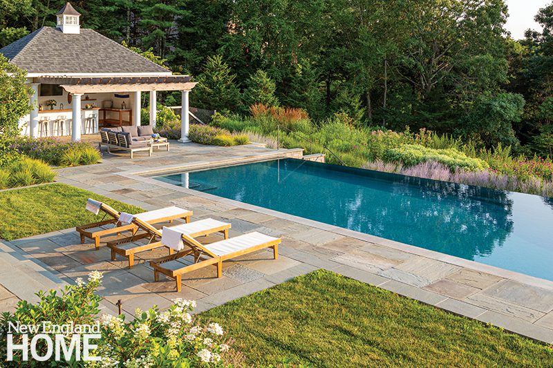 The deck of the forty-five-foot-long pool is paved with Goshen stone. “It gives the pool a clean, contemporary yet natural flavor,” says landscape designer Miroslava Ahern, who used Caledonia granite for the pool’s apron. The wellness pavilion is reflected in the water. It has a serene outdoor patio space used for yoga.