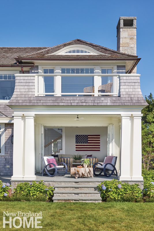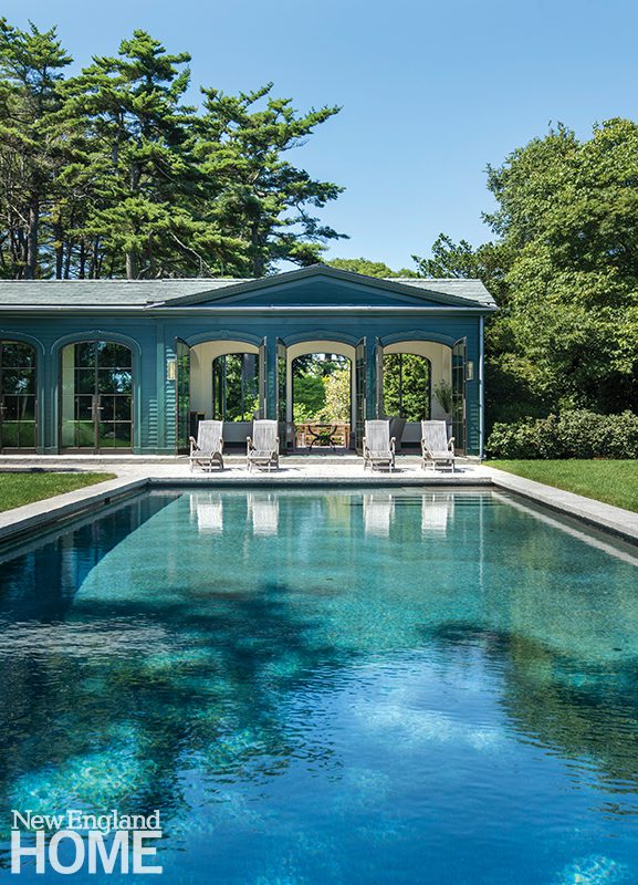 The U-shaped home hugs the backyard and swimming pool. Brooks & Falotico designed the landscape, incorporating fieldstone planters that Fabio Albino of Palmeiras Landscape Designing filled with hydrangeas that change colors throughout the season. The gray vertical board-and-batten volume to the left houses the primary suite.