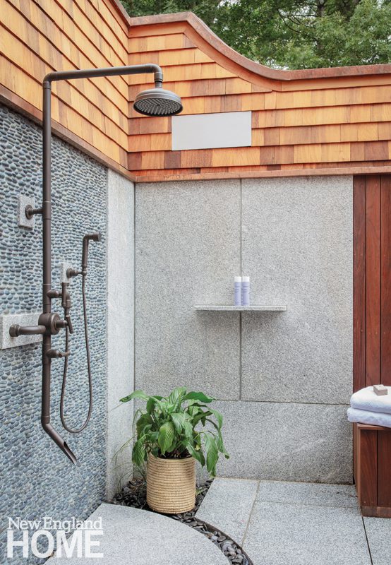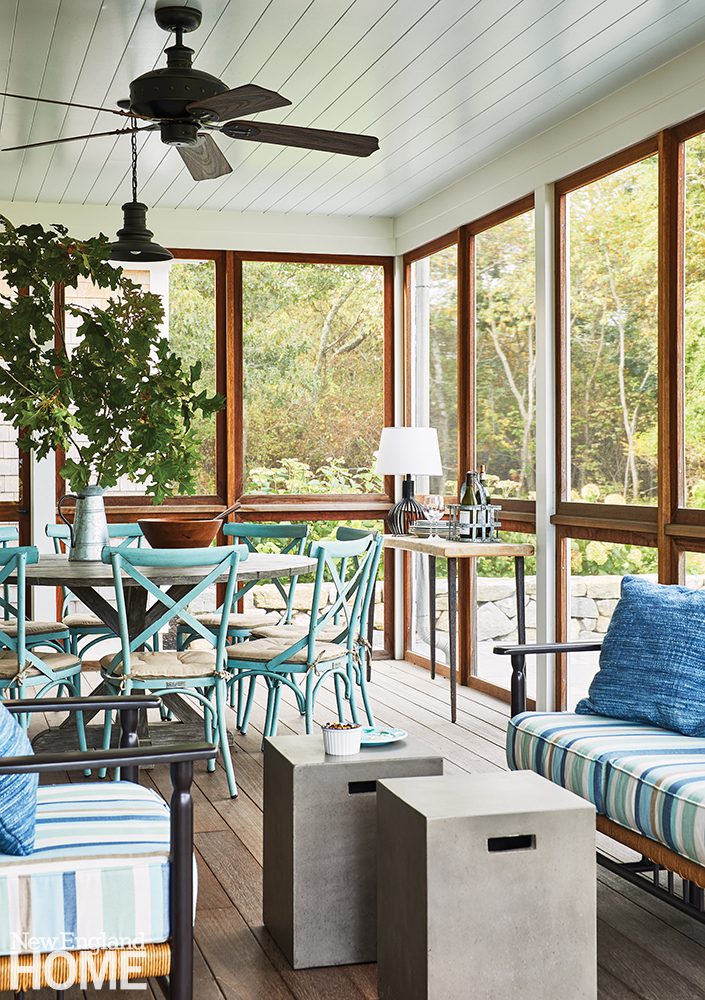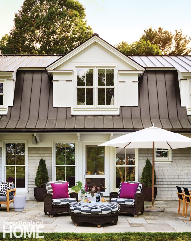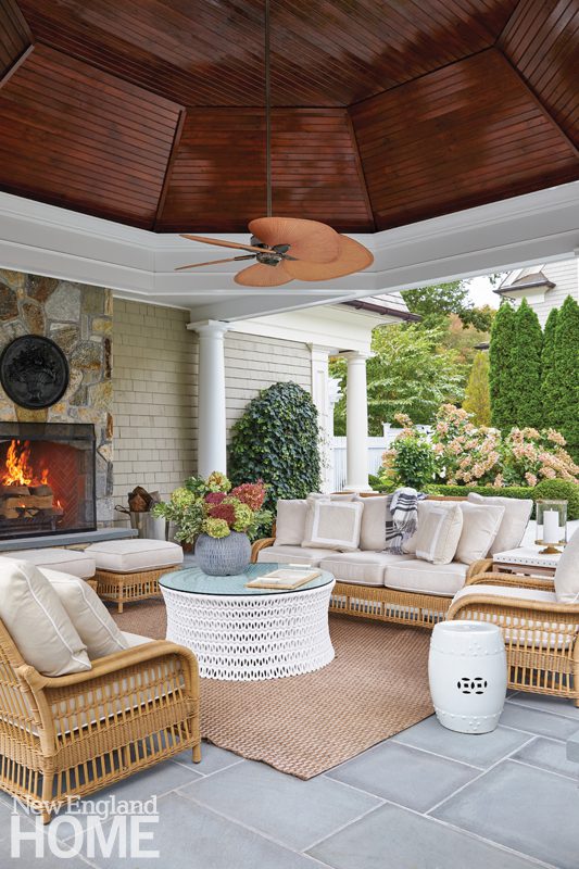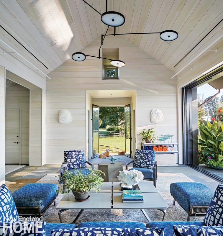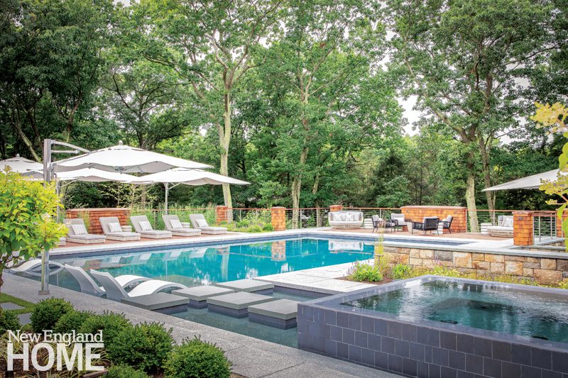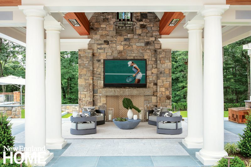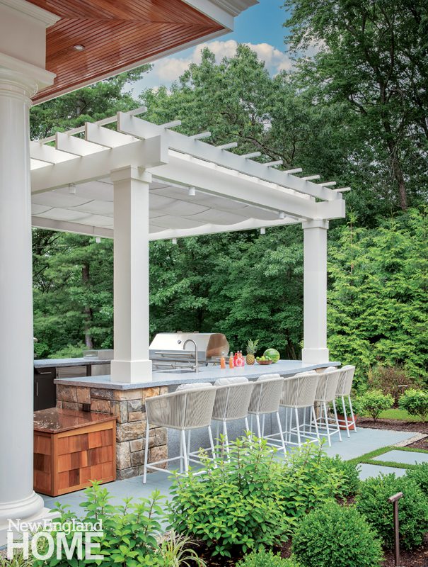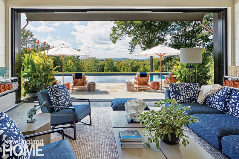 A pool pavilion designed by architect Kevin ten Brinke is the focal point of this new backyard entertaining area in Weston, Massachusetts. Interior designer Rachel Reider furnished the space with a sofa and coffee table from Sutherland, pillows upholstered in a Perennials fabric, and a rug from Landry & Arcari Rugs and Carpeting.
