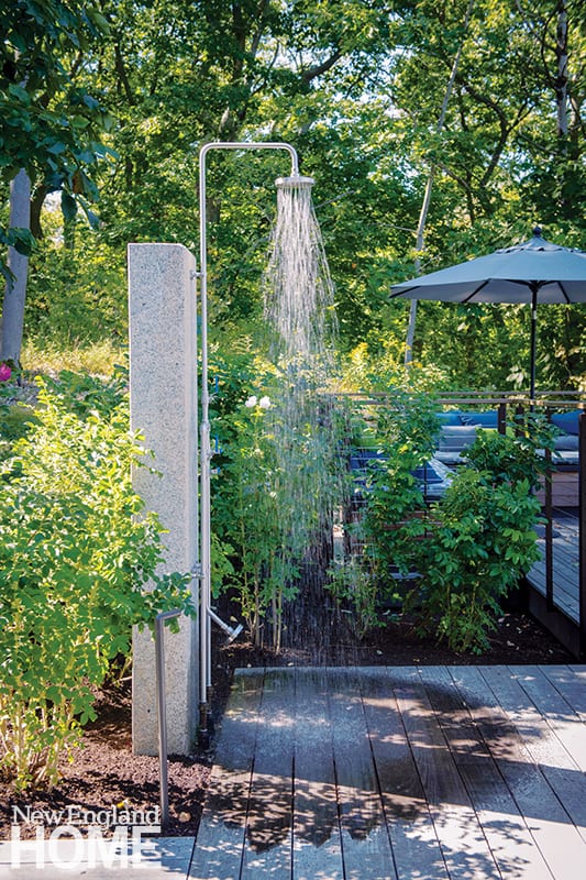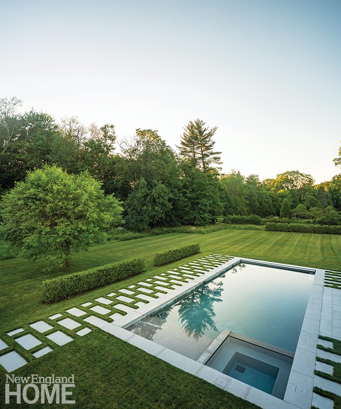 Working with existing changes in grade, the pool sits higher than the landscape beyond, providing an elevated view of the harbor; local granite coping and ipe decking create the pool’s quiet palette, which is offset by the property’s most colorful gardens, filled with catmint, ferns, viburnum, and lowbush blueberry.