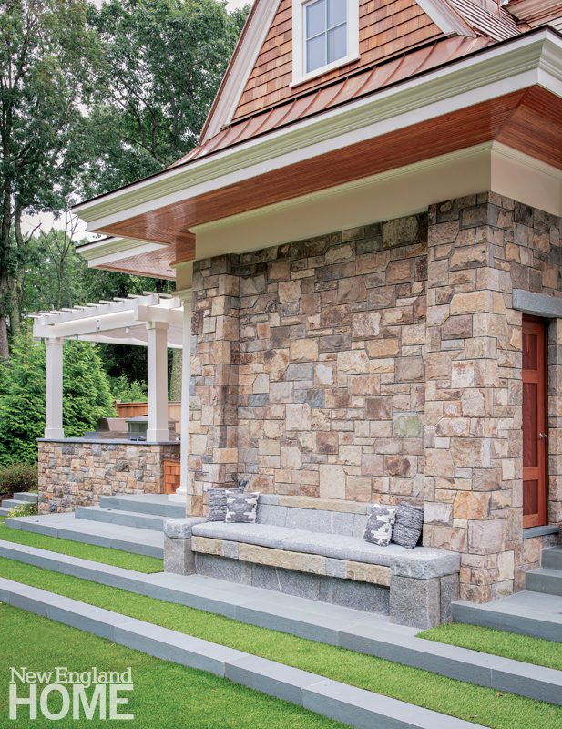 The home boasts two grilling areas, one on the patio and a second at the pool house, where a New England Fieldstone fireplace provides warmth after the sun sets.