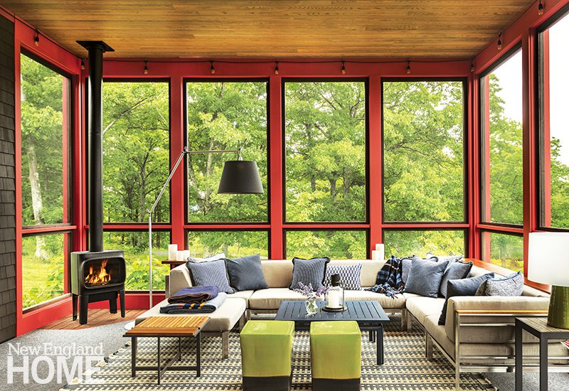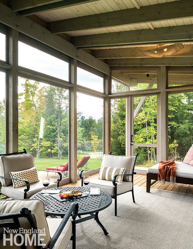 A screened porch located off the pub can be closed off with folding glass doors. In the clients’ former house, the main living areas were on the upper level with little connection to the outdoors, so the goal for this project was to unite the living spaces with nature as much as possible and allow the lake to take center stage. “We wanted to create the feeling of these big public spaces stretching over the water,” notes Knerr.