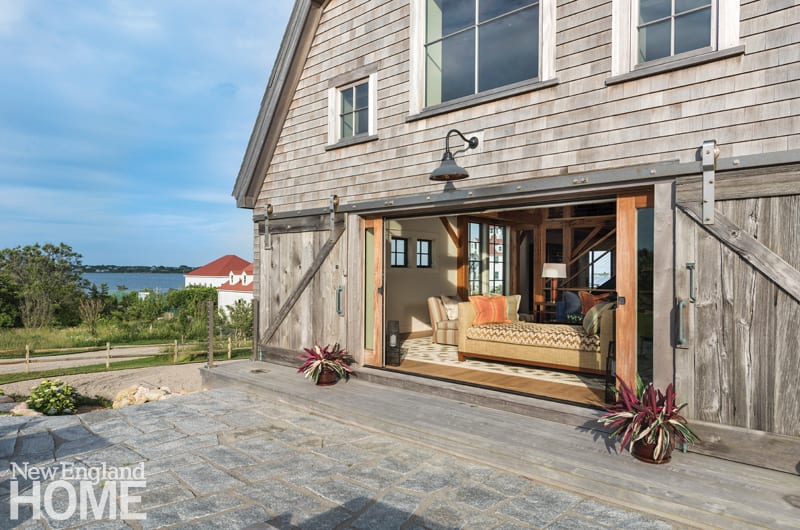 In the living room, a daybed beckons would-be nappers to take in ocean air thanks to gigantic barn doors that required extra structural supports. “There are portals to the outdoors everywhere, making it easy to commune with nature,” designer Courtney Taylor says. The house and patio overlook the red-roofed, 1930s-era Coast Guard Station.