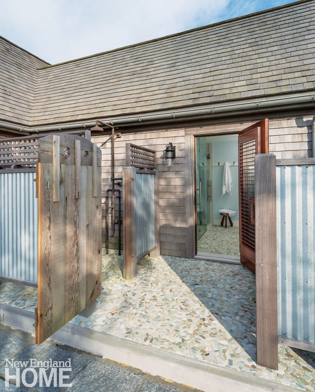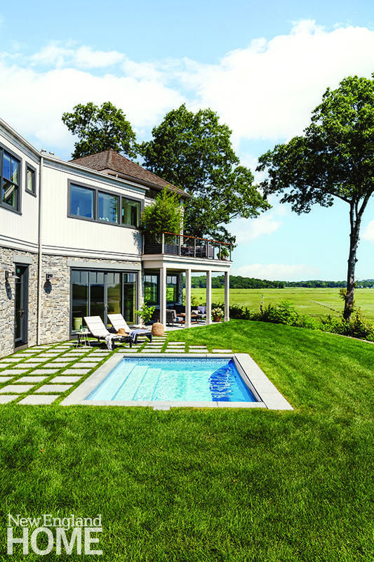 A raised terrace and infinity pool extend into the backyard, which abuts a saltwater pond with views of the bay beyond. Connecting landscaping and hardscaping with the architecture was an important element of the design for Polhemus Savery DaSilva, the firm responsible for the architecture, landscape architecture, and construction of the house.