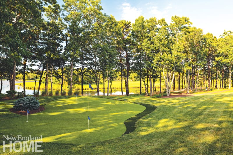 Delightful views from the back terrace include a square sculpture garden that was cleverly installed just off the Shingle-style house designed by Shope Reno Wharton. Planted with purple hardy geraniums and Japanese Stewartia trees that bloom all summer long, it features a playful royal-blue-glazed ceramic apple sculpture by Lisa Pappon.