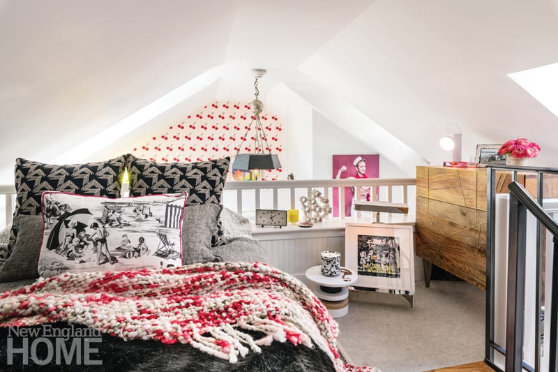 Graphic black and gray upholstery and bold jolts of color stand out against the statement-making blush-pink walls of the living room. The oil painting by Croatian artist Stjepan Šandrk pictures a young woman holding a cup of coffee and a cell phone in front of an 1866 masterpiece by Gustave Courbet.