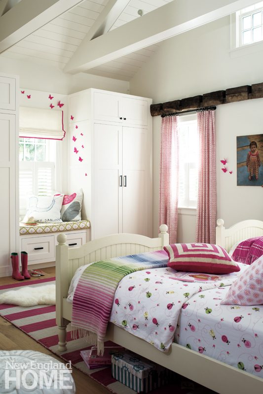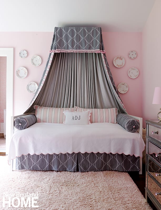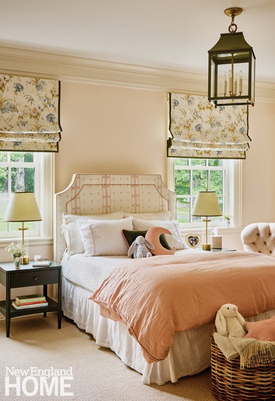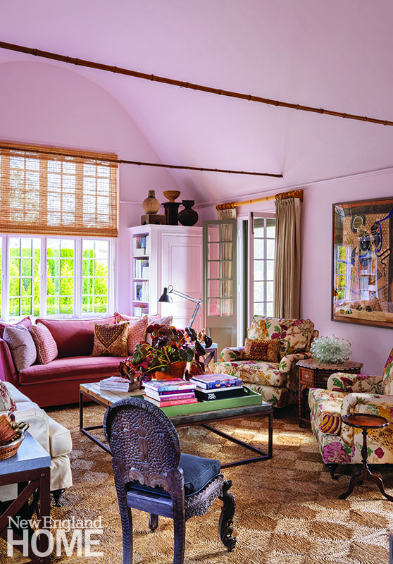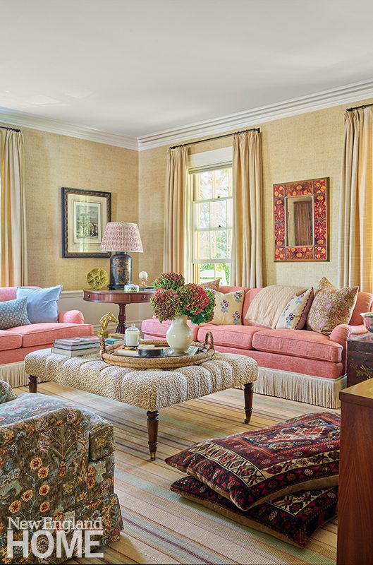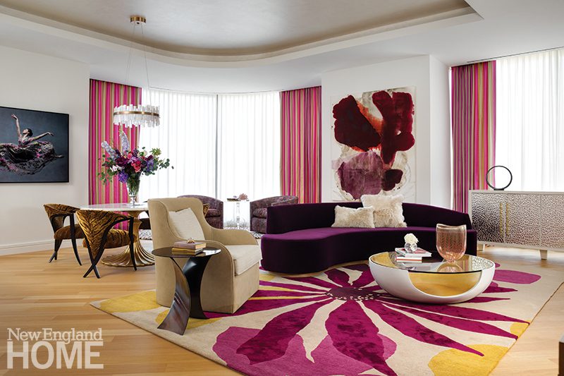 The living room windows in this 1818 Beacon Hill condo are original (think single pane), so interior designer Robin Gannon devised blanket-like curtains lined in felt to combat the winter cold. White piping on a curved custom sectional breaks up its expanse of blue velvet and brings a touch of casualness to the formal space.
