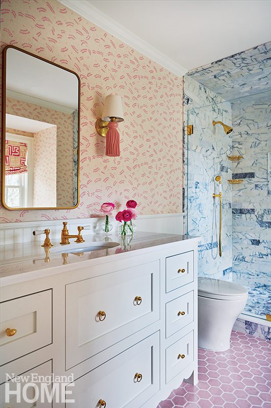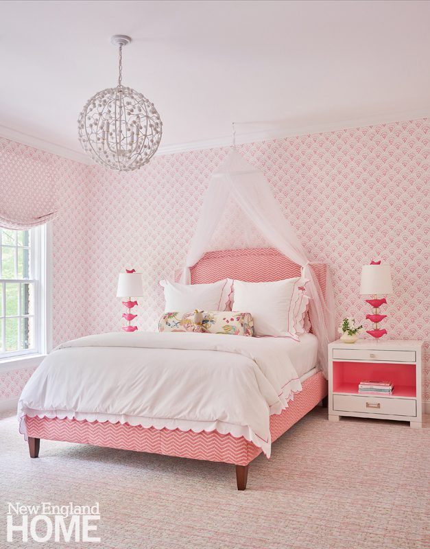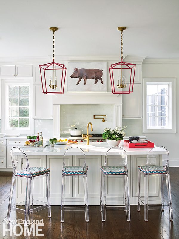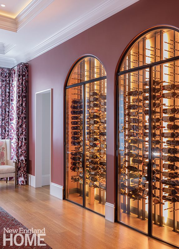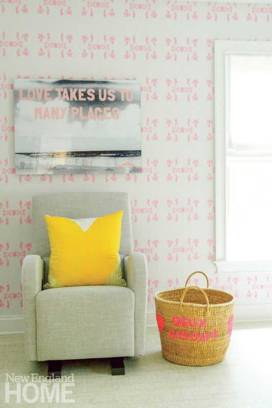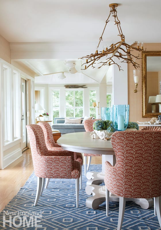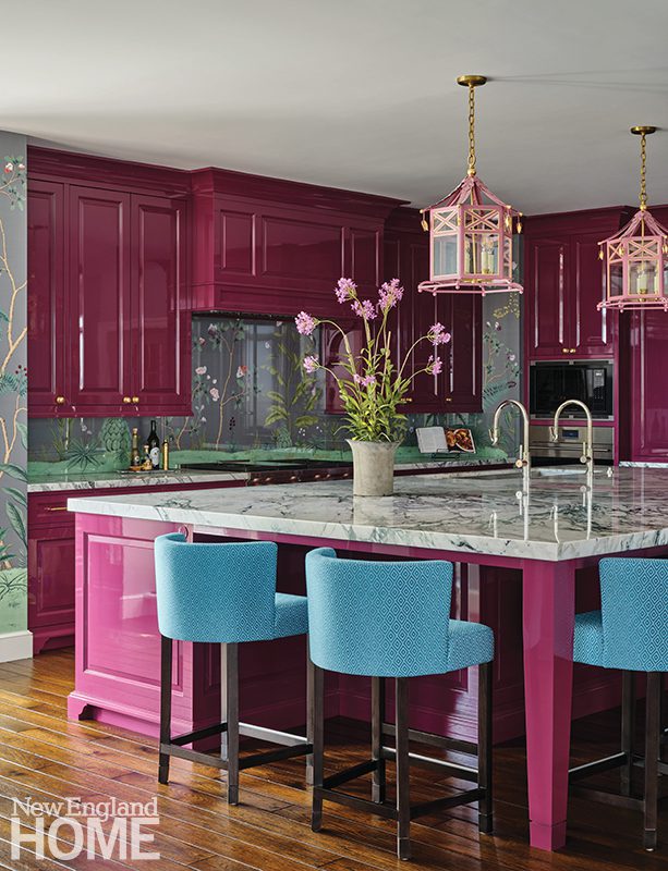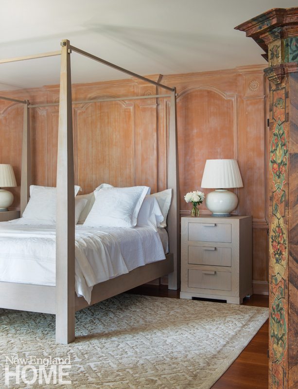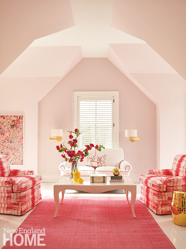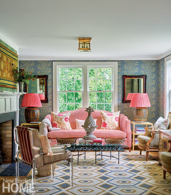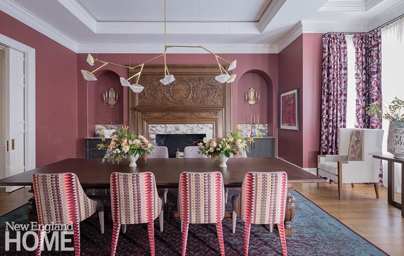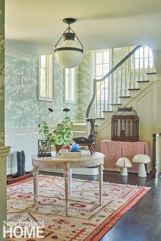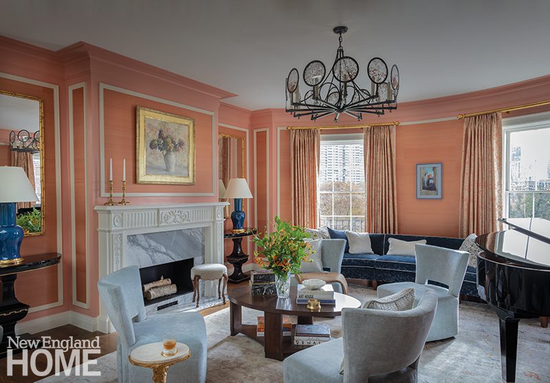 Designer Honey Collins animated the entry hall of this Beacon Hill condominium with chinoiserie panels from Gracie. “It gave that little space a lot of life,” says the designer, who completed the look with a pair of Billy Baldwin slipper chairs covered in salmon mohair from de Le Cuona and an area rug from The Rug Company.