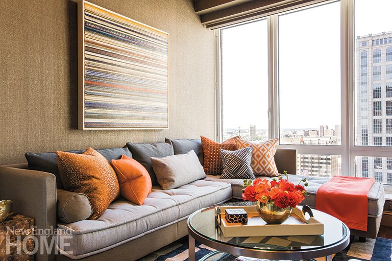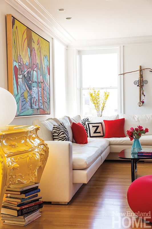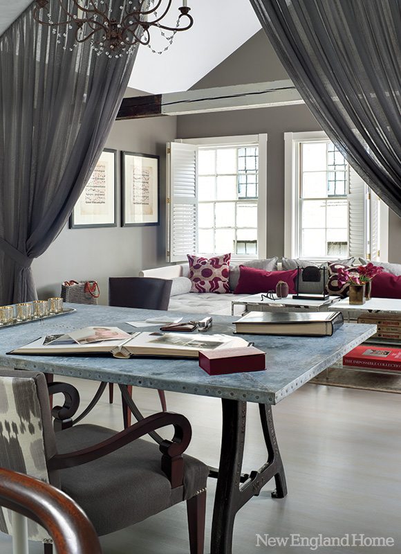 A smattering of well-placed color enlivens the family room without upsetting the neutral paletteâs serenity. Accessories are primarily limited to books and natural elements like green plants and pickings from the garden to maintain the airy ambience. A saw-horse table by Waldoâs Designs serves as a handy desk, while John Booneâs upholstered club chairs and welcoming sofa guarantee comfort.