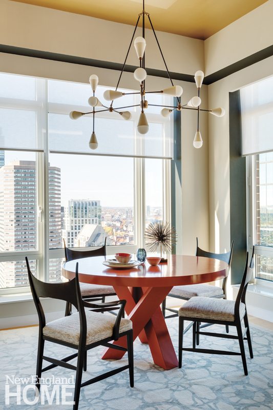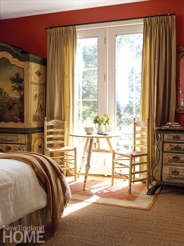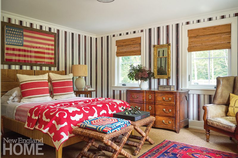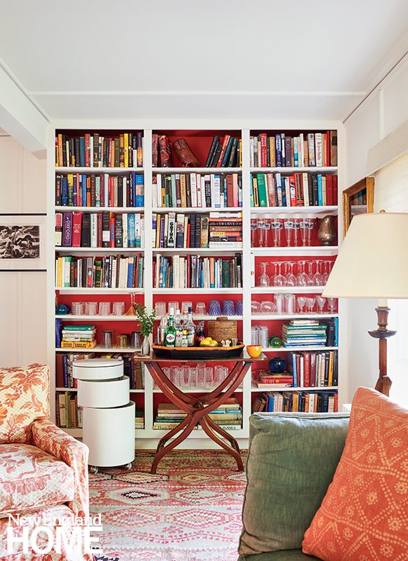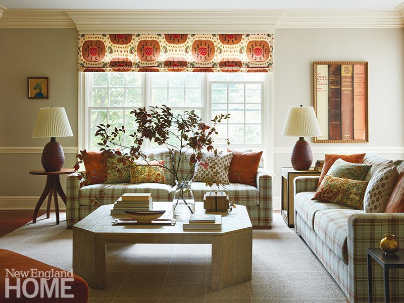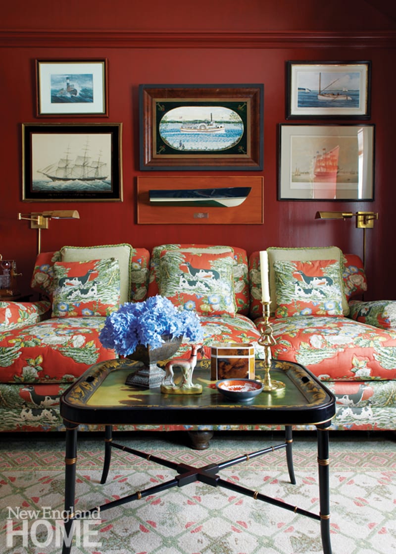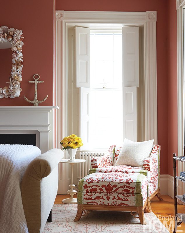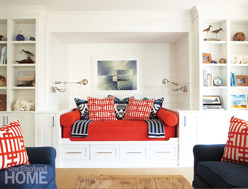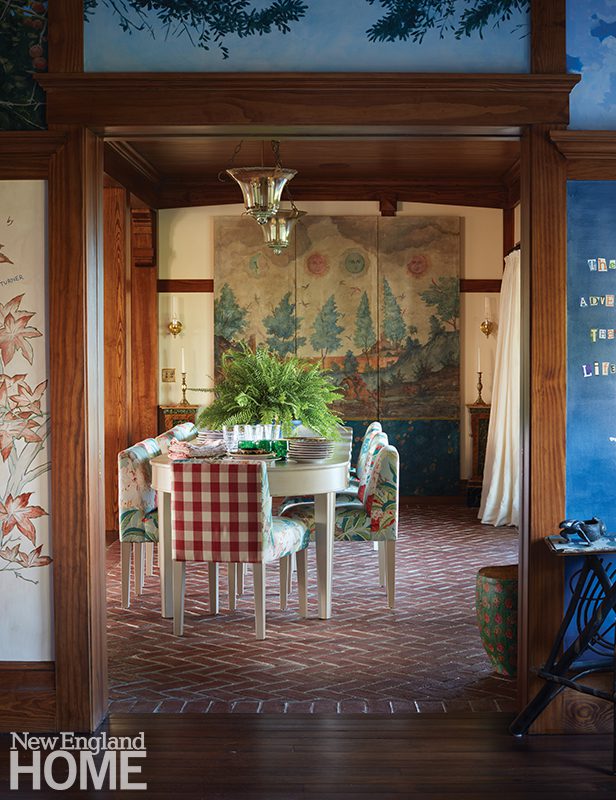 A coffered ceiling inset with anaglypta lightens the once-dark living room. The blue-red of the Verellen sofa and chairs from Artefact Home|Garden plays to the orange-red tones of the original fireplace. Jim Anderson Stained Glass custom designed the window. Far left: Architectural designer Jennifer Birnstiel modeled posts and brackets on the front porch after Felsted, the 1897 Maine summer home built for Frederick Law Olmsted.