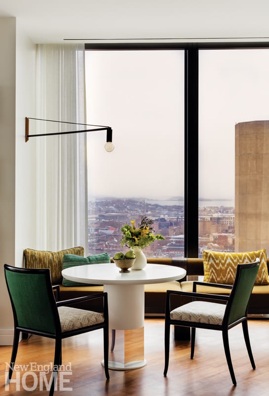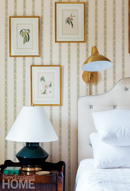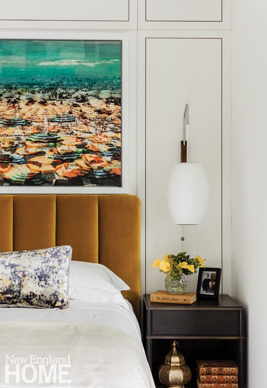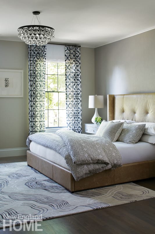 In the living room, Monahan cleverly crafted the windows to appear larger without changing their exterior dimensions by adding a bank of mirrors above the panes. To make a sisal rug pop, she layered a cowhide rug beneath overlapping glass sectional coffee tables. The wall displays the ethereal lines in a pair of works by up-and-coming Connecticut artist Tracie Cheng, while furniture is comfy but sleek.