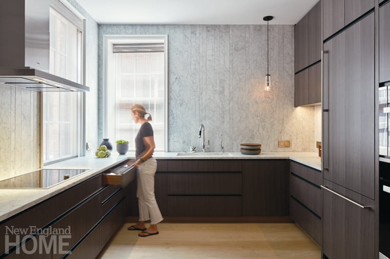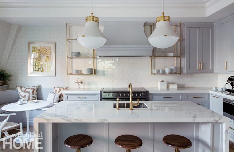 Collins came up with a kitchen that’s as posh as it gets, from the custom cabinets by Furniture Design Services to the brass shelving by Palmer Industries. Even the walnut stools step it up with gleaming brass bases.