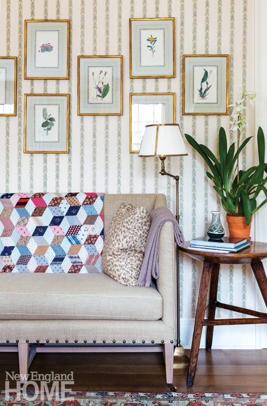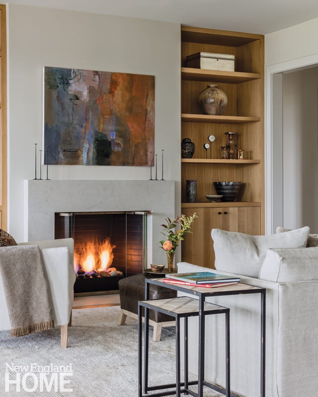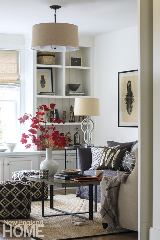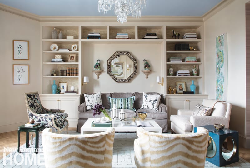 New built-ins provide the living room with storage and a display area for books and mementoes. Skillful at mixing, Collins teams an antique floral-dressed chair with a cool David Iatesta coffee table. Unexpected materials add punch. The eye-catching octagonal mirror, for instance, is made of porcupine quills.