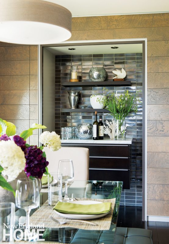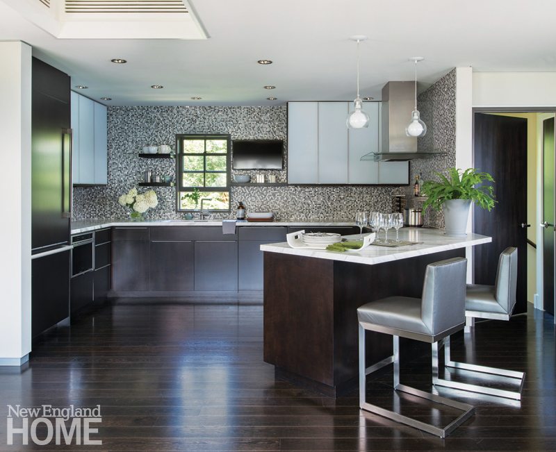 Dark custom cabinets with sleek aluminum pulls inhabit the kitchen, buffet, and concrete-topped wet bar, and a glass-topped Brueton dining set that wouldn’t be out of place in a Manhattan apartment aligns with a custom, circle-top window set directly above the carriage-house doors.