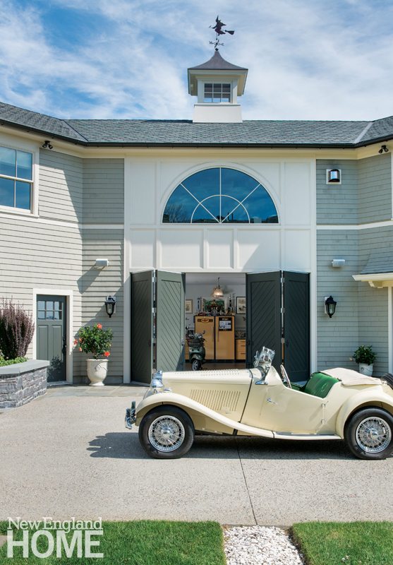 With a vintage car collection below and a stylish apartment above, a coastal Rhode Island carriage house is a modern take on the traditional.
