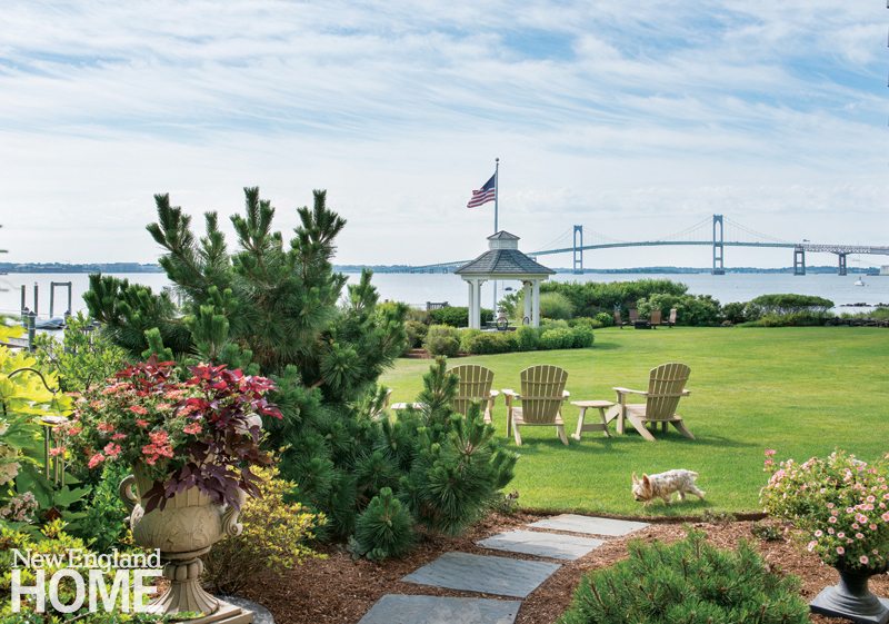 Located on Narragansett Bay’s East Passage and with a postcard view of the Claiborne Pell Newport Bridge, the manor house on the property dates back only to 2006. In 2013, the owners acquired an adjoining lot as well as a second lot just inland. The plan: build a home for their daughter across the street and add a carriage house on the now-merged waterfront lots, leaving ample space between the two buildings so that the daughter’s home would retain its own magnificent vistas.