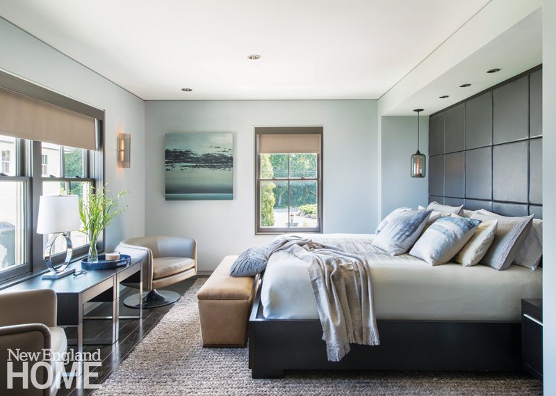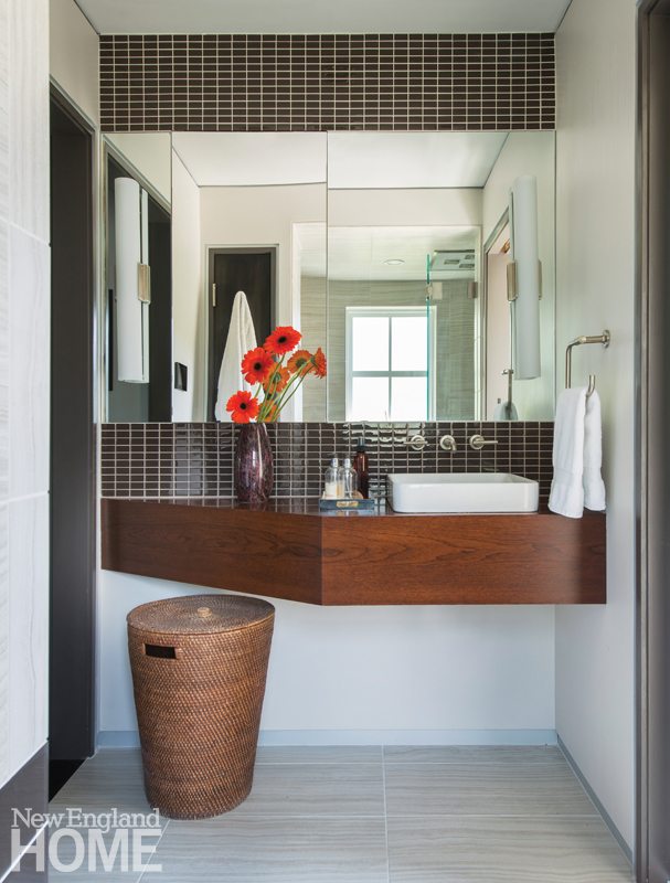 Sleeping quarters are tucked into the back of the building, but ample natural sunlight from three windows helps offset the heavy feel of the master bedroom’s leather-clad swivel chairs and platform bed backed by a wall-size Spinneybeck leather-paneled headboard. Large-format Italian tile and a chromatherapy shower, by contrast, make the master bath intrinsically light and bright.
