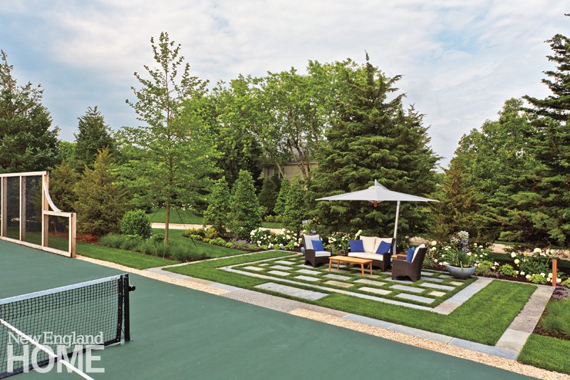Landscape architect Dan Gordon undertook a very different challenge in designing the pool and tennis-court areas for a mid-Cape home. The house sits on a long, linear site in an established neighborhood where nearby houses are, says Gordon, “older properties with lots of rhododendrons. They have kind of an estate character, rather than beachy.”