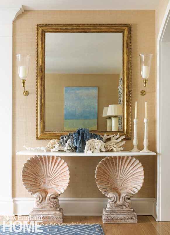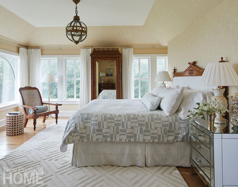 Grasscloth makes an appearance on walls throughout the home. “That gives the house a shore vibe, and it helps to warm up rooms so much more than painted sheetrock,” the designer says.